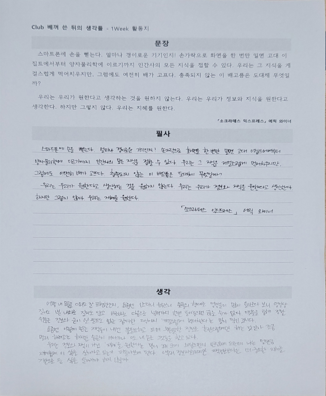 우리는 정보와 지식이 아닌 ‘지혜’를 원한다는 말이 꽤 크게 와닿으면서 반성하게 되는데 나는 얼만큼 지혜롭게 이 삶을 살아가고 있는가 되돌아보게 된다. 아무리 정보사회라지만 지식정보보다는 더 중요한 지혜를 기반으로 둔 삶을 살아가야 하지 않을까.
